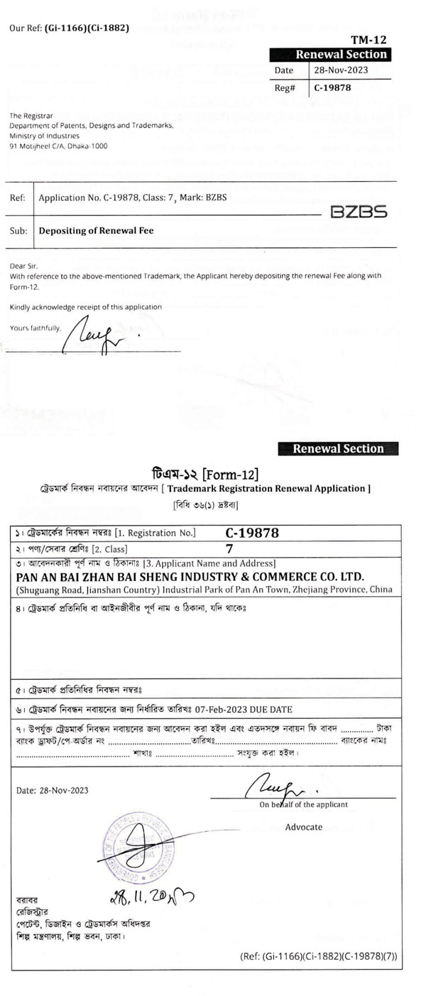 BZBS C-19878 Bangladesh Renewal Receipt